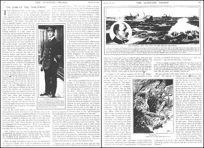 THE LOSS OF THE "VOLTURNO"THE DESTRUCTION of the Volturno instantly calls up memories of the Titanic, and tho the death list is shorter in the case of this second sea disaster within eighteen months, it seems to the New York Sun that the details of the story are "equally tragic and perhaps actually more painful." The earlier catastrophe did not surpass the later in dramatic quality, agrees the New York Evening Post, for there was never before on the ocean such a scene as that of the night of October 9 - "a great steamer burning helplessly in a gale, which prevented the safe launching of life-boats, with ten or eleven ocean liners rolling in the high sea nearby in the hope that the gale might abate in time to save some of the hundreds of lives menaced by the waves and by fire." The cry for a really "unsinkable" ship that went forth after the loss of the Titanic now gives place to the demand for a ship that is truly "fire-proof." There was no lack of life-boats on the Volturno, but they were rendered useless, and became, indeed, a source of peril; and these circumstances call out many an editorial utterance on the need of better fire-fighting apparatus and more satisfactory methods of transshipping passengers in a heavy sea. The only cause for congratulation found by the press, save for the acknowledgements of the seamanship and courage displayed in the work of rescue, is the work of the wireless. It seems to be the unanimous opinion that, had there been no S.O.S. call, instead of the rescue of 532 from a total of 657, there would have been none left to tell the tale of the loss of the Volturno, save by the rarest chance. As the Philadelphia Record remarks, "there was no confusion in the working of the wireless, no interference and breaking into the conversations between the calling vessel and those who answered, and every ship within hail responded with alacrity, so that at the time of the rescue there were ten steamers standing by." Evidently, concludes The Record, "the lessons of the earlier disaster have been heeded, and the wireless has become a well-managed life-saving device."