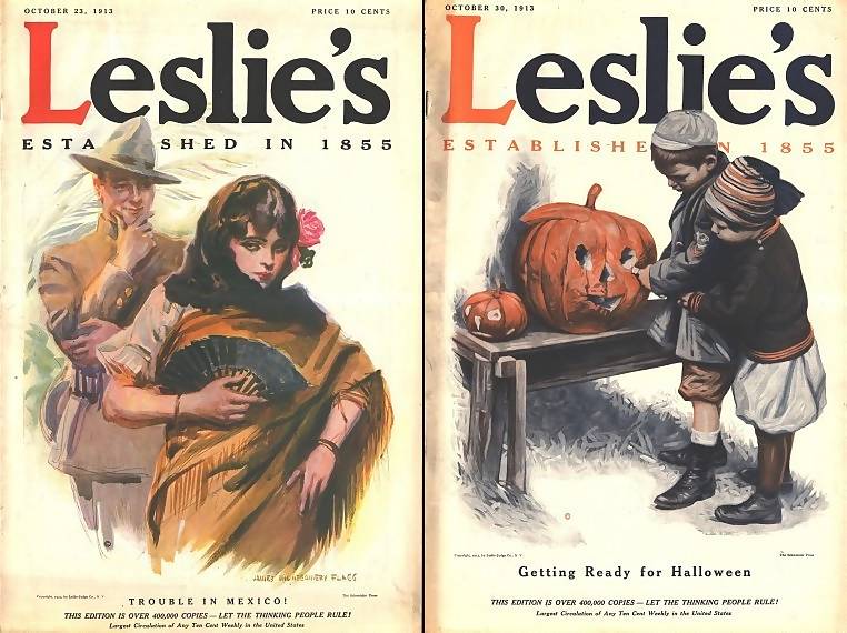 And last, but certainly not least, here are the interesting covers of the 2 issues of Leslie's Illustrated Weekly Newspaper that are the subject of this page. The artwork for the left image is by famous illustrator James Montgomery Flagg. I cannot see an artist's name re the image at right, but the publication says it is 'After a photo'. Of the two covers, the one at right, i.e. that of Oct. 30, 1913, has the greater appeal to the webmaster. A giant image of that cover is available here.