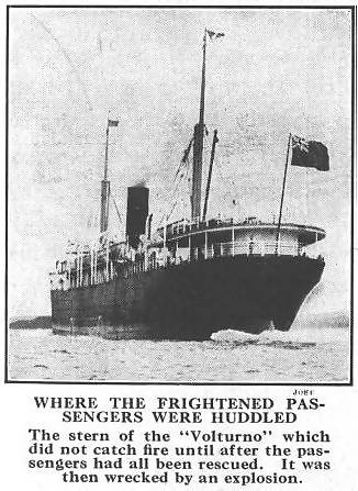 The first item to be presented on this page re the Oct. 30, 1913 issue, must surely be the wonderful drawing by 'celebrated marine artist C. McKnight Smith'. A quite magnificent piece of work as I think you will agree. Sepia in colour. The drawing as published fills a full page & thus is large indeed (approximately 13 3/4 x almost 9 inches in size with the texts at top & bottom also), &, being so large, I am unable to scan it in a single pass. I have tried to 'knit' or 'stitch' the two scanned parts of it together as best I can. Alas you can see the join, & the register at the top of the image is not perfect when it IS perfect at the bottom. Some distortion in the scans it would seem. What I will provide is a full screen width image of result. And an image of just the Volturno. And, should you wish to see a bigger image of the work, it is available here, at the click of the mouse. But be warned! That image is very large. Do view it full size!