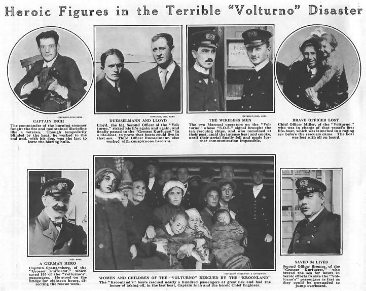 The "Volturno," of the Uranium Line, bound from Rotterdam to Halifax and New York, caught fire in mid-Atlantic in a terrific storm. Ten steamers, summoned by wireless, rushed to the doomed vessel and the most heroic efforts were made by boat crews during an entire afternoon and night, but the waves were mountain high. Efforts were vain until the arrival of the Standard Oil Steamer "Narragansett" laden with oil. The "Volturno" had 657 passengers and crew and 136 of these were lost in the life boats launched before the arrival of the rescuing steamers. The following st eamships surrounded the "Volturno" and remained until the gale abated and all the remaining passengers and crew were rescued : "Kroonland," "Grosser Kurfuerst," "La Touraine," "Narragansett," "New York." "Seydlitz," "Deconian," "Carmania," "Czar," "Minneapolis," and "Rappahannock."THE FINE STEAMER WHICH REACHED THE "VOLTURNO" FIRST
