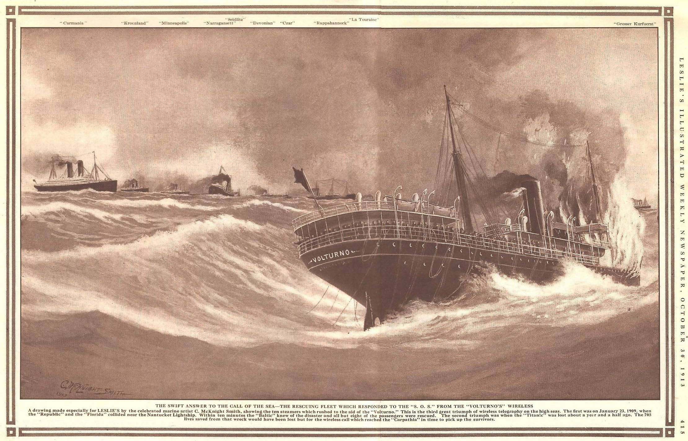 THE SWIFT ANSWER TO THE CALL OF THE SEA - THE RESCUING FLEET WHICH RESPONDED TO THE "S.O.S." FROM THE "VOLTURNO'S" WIRELESSA drawing made especially for LESLIE'S by the celebrated marine artist C. McKnight Smith, showing the ten steamers which rushed to the aid of the "Volturno." This is the third great triumph of wireless telegraphy on the high seas. The first was on January 23, 1909, when the "Republic" and the "Florida" collided near the Nantucket Lightship. Within ten minutes the "Baltic" knew of the disaster and all but eight of the passengers were rescued. The second triumph was when the "Titanic" was lost about a year and a half ago. The 705 lives saved from that wreck would have been lost but for the wireless call which reached the "Carpathia" in time to pick up the survivors.