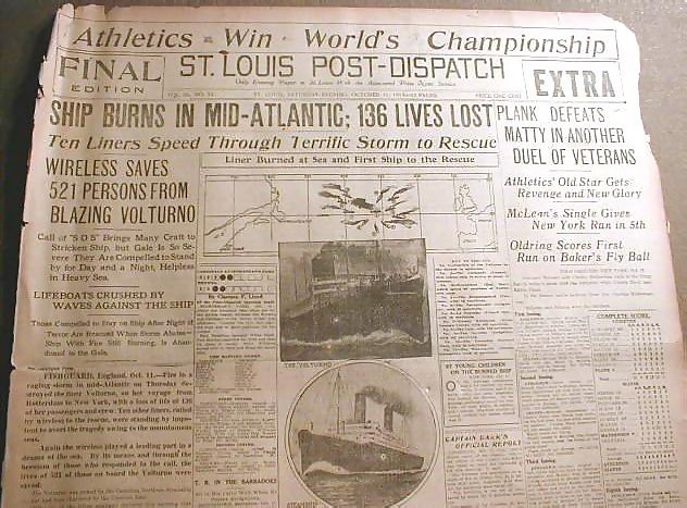 The Volturno, valued at ₤45,000, was laden with emigrants, while the Templemore, valued at ₤43,000, was carrying cargo, including tobacco estimated to be worth ₤175,000.2) From the Liverpool Echo of Oct. 13, 1913