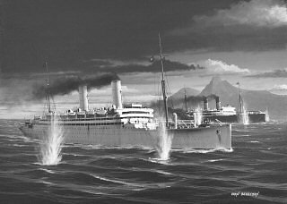 I have long sought some German content in these pages. An e-Bay item which was available as a 'Buy-It-Now' item in October 2006, provided a German image of the Cap Trafalgar sinking. The image's origin was not stated. So I cannot tell you in which publication the image appeared nor the name of the artist. Should I include the image here? I have not sought permission to use this image in these pages and would (with regret) remove it upon the request of 'z375' the e-Bay 'Power Seller' vendor from Germany (Roland Fuchsle of Augsburg). Hopefully however, inclusion of the image here may have assisted the vendor with his sale. (the e-Bay listing is now long gone). The webmaster hopes that may prove to be the case. I 'tidied up' the image for inclusion here and straightened it to make it more perfectly horizontal.