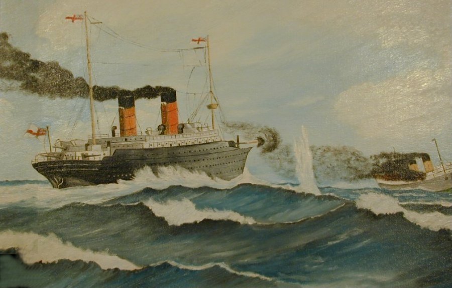 It is a beautiful work indeed! And a pleasure to be able to record on this page. Carmania of course is in the foreground. With Cap Trafalgar, in flames, in the distance at lower left.