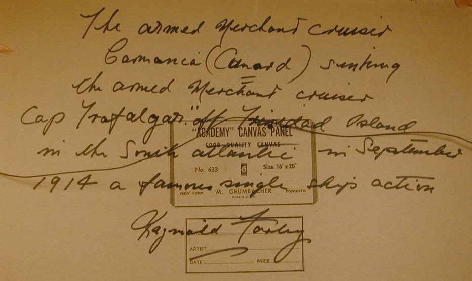 Should you wish to learn more about the artist, there is biographical data available here & here. And this National Maritime Museum web site has many hundreds of his works on line, but not, it would seem, these particular works. But on this National Maritime Museum page, you can view another Wyllie work dating from 1923, also of the Carmania/Cap Trafalgar sea battle. Which work will hopefully also, some day, grace these pages. The image appears on the Museum page courtesy of Liz Dixon. But the site's copyright rules seem not to permit showing the image here, even when this is a non-profit & informational site. And as I reread the page, the work would seem, in fact, to be by Charles Dixon.