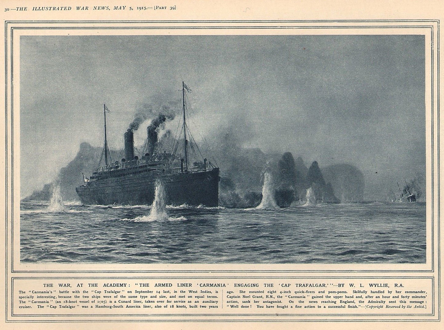 A fine print of Carmania (at left) battling Cap Trafalgar (with a terminal list), in Sep. 1914. This particular print was available here via e-Bay in late Nov. 2014. It may well still be available for purchase. The vendor described the item as having been 'carefully removed from a volume published in 1916'. It would seem that that volume was, in fact 'The Times History of the War'. I am not aware of the name of the artist. Do drop by that e-Bay listing.