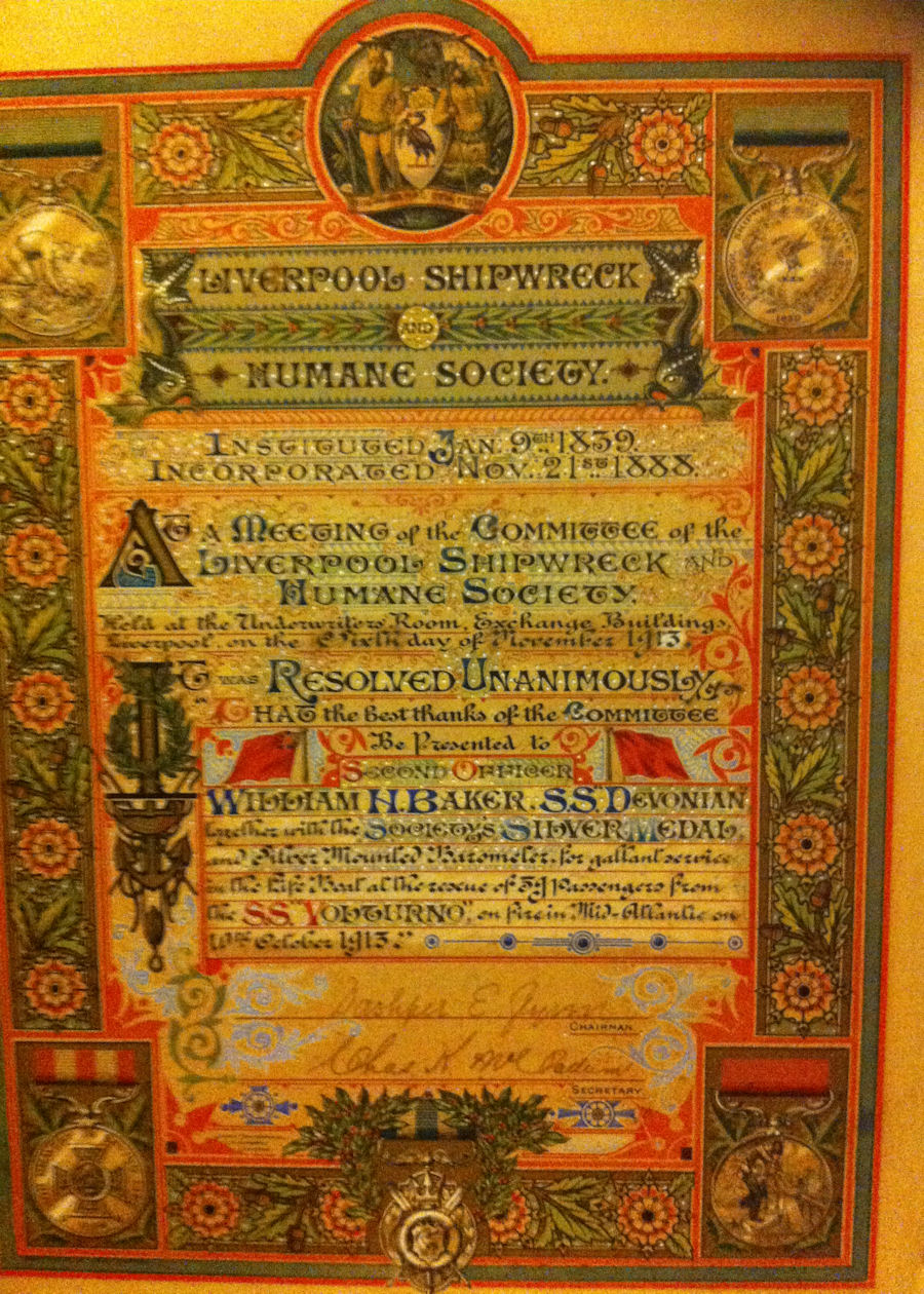 Raymond has kindly given me a scan of a certificate which was given to his grandfather by the Liverpool Shipwreck and Humane Society on Nov. 6, 1913 for efforts aboard Devonian lifeboat number 5. The inscription reads