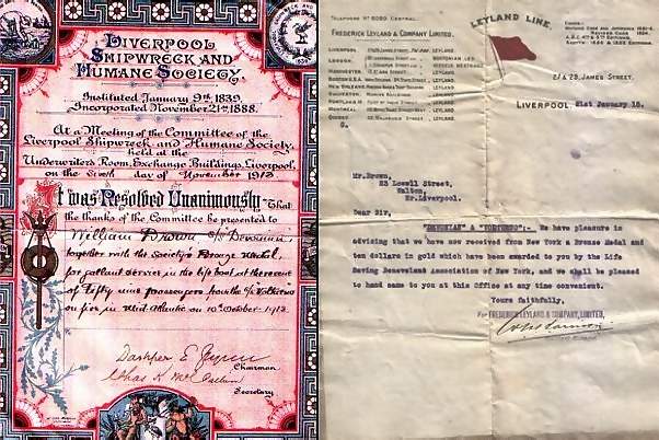 Also below (right) is a letter written by Leyland Line to William Brown in Jan. 1915. It is a bit hard to read on screen but advises Mr. Brown "We have pleasure in advising that we have now received from New York a bronze medal and 10 dollars in gold which have been awarded to you by the Life Saving Benevolent Association of New York, and we shall be pleased to hand same to you at this office at any time convenient." Raymond Brown advises that with the passage of time the medal is no longer in the family's possession. The 10 dollars in gold surely found a useful purpose the moment it was received! Thank you so much Raymond!