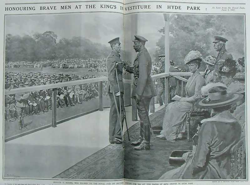PRIVATE T. HUGHES, WHO WALKED TO THE ROYAL DAIS ON CRUTCHES, RECEIVING THE V.C. AT THE HANDS OF KING GEORGE IN HYDE PARKOn Sunday of last week there took place in Hyde Park, in full view of a London crowd, a ceremony which was at once very simple and very grand, when the King invested some 350 men with the honours they had won for gallantry and good service during the war. There on the grass and among the trees of Hyde Park the memories of months of selfless devotion walked visibly as in a long procession. The men who had done "great and noble service to their country" received from the King the large and eternal thanks of the Empire. Simple though the investiture was, there was enough to fire the imagination. One by one these men - or, in a more touching moment still, their relatives - came forward, saluted, and went their way again, lost to sight at once in the crowds. One by one, as the slight figures in khaki or blue separated themselves from the small company in front of the dais, ascended the sloping ramp, and stood isolated for a moment before their King and their own people, there was a tense moment which was very keenly felt.