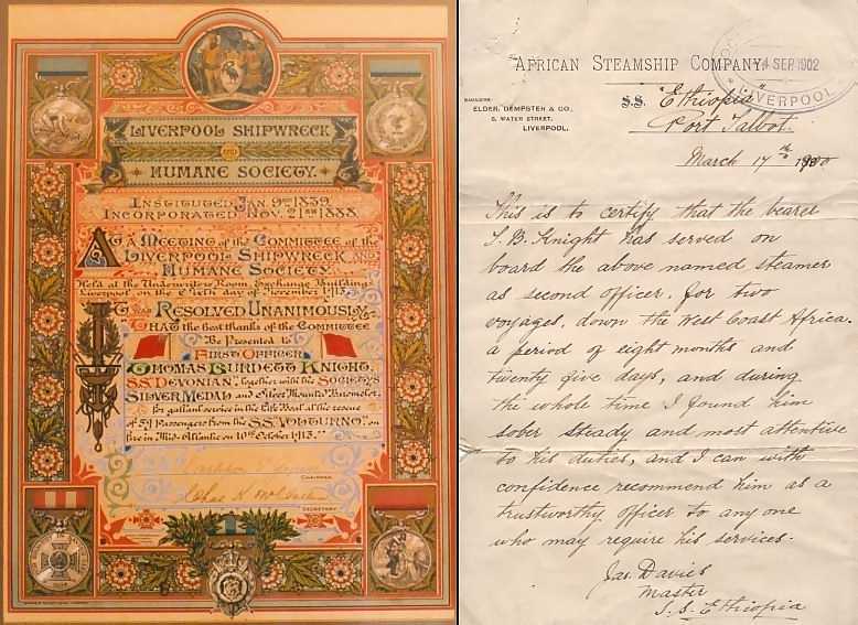 We do have an image of the 'Liverpool Shipwreck and Humane Society' illuminated certificate given to Thomas Knight on Nov. 6, 1913. His certificate is very differently coloured, I see, from William Brown's as above, came with a silver medal in his case & a 'Silver Mounted Barometer'. The certificate appears next along with a splendid testimonial letter which predates the Volturno incident by a great many years but is interesting reading indeed. The barometer is gone with the passage of time but the plate which was fixed on the box does survive.