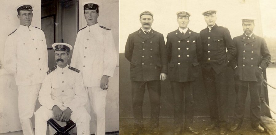 And here, in contemporary images, is 1st Officer Knight in dress uniform (top right) together with another image of him (second from left) with, it is believed, other Devonian officers.