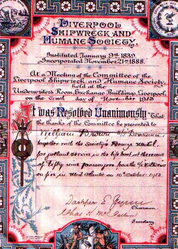 It was resolved unanimously "That the thanks of the Committee be presented to William Brown, S/S Devonian, together with the Society's Bronze Medal, for gallant service in the life boat at the rescue of Fifty nine passengers from the S/S "Volturno" on fire in Mid-Atlantic on 10th October 1913".