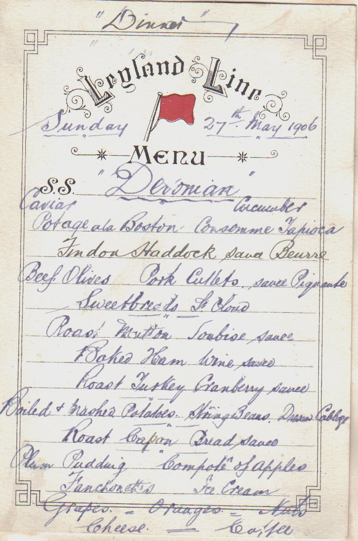 David further advises that George Cain’s three sons George, William & Alexander, (but not his two daughters), subsequently lived at and were educated by The Royal Liverpool Seamen's Orphan Institution, which educated the sons of deceased mariners. His wife lived on - to the age of 86. She died in New South Wales, Australia, in 1969, 52 years after her husband lost his life in 1917.A SPLENDID 'DEVONIAN' DINNER MENU - FROM A MAY 19, 1906 VOYAGE TO BOSTON