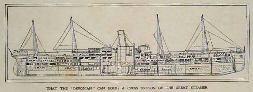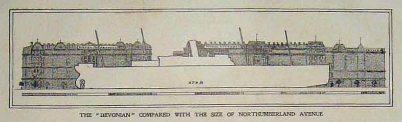 On Sep. 22, 1900, 'The Sphere' published an article about Devonian, that had then just sailed on her maiden voyage from Liverpool to Boston. The item is of particular interest to the webmaster, because it compares the vessel's length with the length of Northumberland Avenue in London, England, a street which runs from Trafalgar Square to the Embankment. The webmaster's very first job was at an office on Northumberland Avenue in a building that one would today call a 'flatiron' building.
