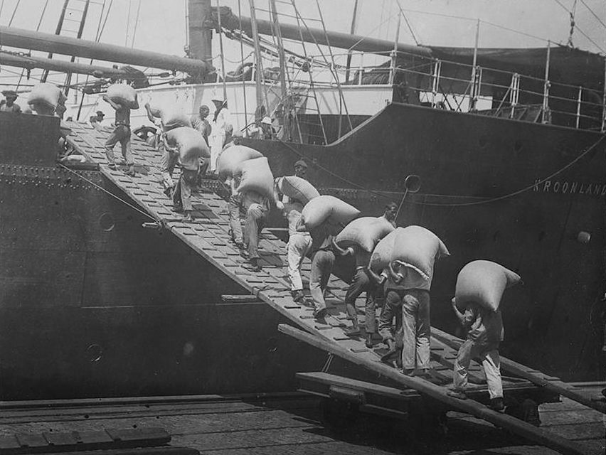 A very fine image indeed, showing workers loading bags of coffee beans aboard Kroonland at Sao Paolo's (Santos) port (Brazil) on Jul. 19, 1927. An e-Bay item in Apl. 2008 Cropped & modified for better presentation on this page. I have not sought the approval of the vendor, 'ydra2000' of Greece, whose store link I provide, for the inclusion of this item on this non-profit & informational page. I trust that will be in order.