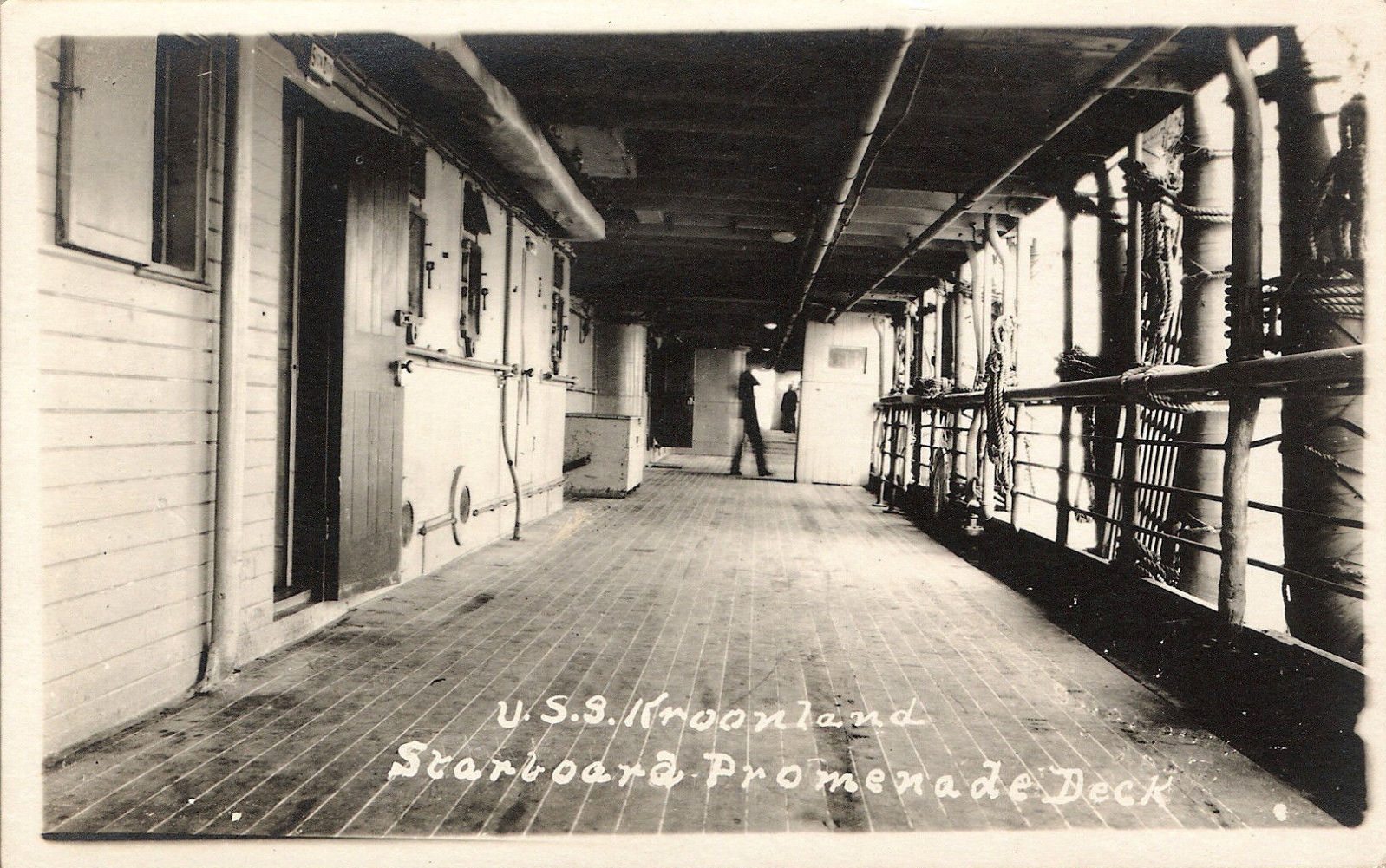 A postcard image of the starboard promenade deck of Kroonland, believed to date from c1920. An eBay item in Mar. 1917 - here. It sold, on Mar. 28, 2017, for U.S. $5.99. A larger image of the card can be seen here. The vessel does not seem, in this image, to be particularly luxurious!