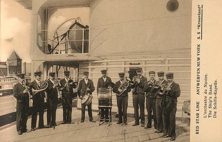 The image of the band was published more than once it would seem. A 32 page, 5 1/2 x 7 1/2 in., booklet for 'Red Star Line' 'ANTWERPEN NEWYORK', featuring 4 vessels including Kroonland, contained the image. That booklet was published, per a Mar. 2008 e-Bay listing, in 1903. The band page looks identical to that already available above by a click of the mouse.